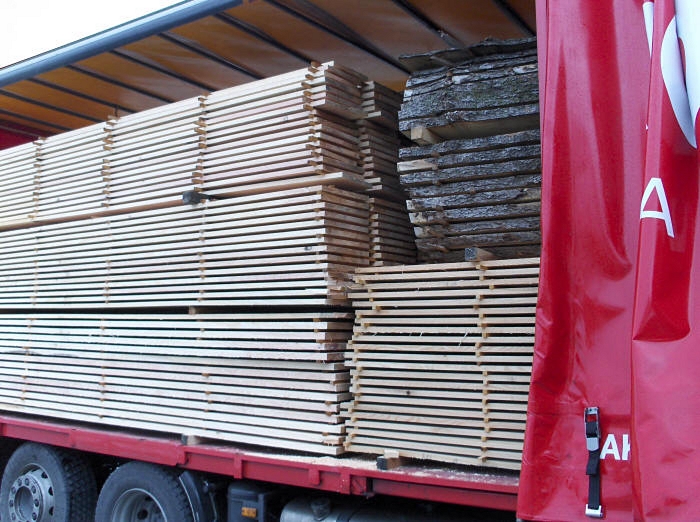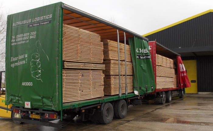 Onder een volle trailer van Althusius levert versgezaagd hout